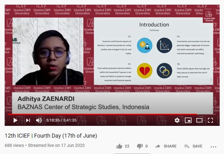 The 12th ICIEF is the oldest, largest and most prestigious conference in the fields of Islamic economics and finance brings together scholars, practitioners and policymakers around the world. In 2020, ICIEF carried the theme "Sustainable Development for Real Economy" with the host of the event were Istanbul Sabahattin Zaim University (IZU) and the Islamic Research and Training Institute (IRTI) / Islamic Development Bank (IsDB). 12th ICIEF took place for seven days starting on Sunday, June 14, 2020 until Saturday, June 20, 2020. The event was opened by the President of the Republic of Turkey, Recep Tayyip ERDOĞAN. The first paper had the opportunity to present on Saturday (06/20 / 2020) which was represented by Aisha Putrina Sari, while the second paper was presented on Wednesday (17/06/2020) represented by Adhitya Kusuma Zaenardi. The presentation went well and conducive. Hopefully, Puskas BAZNAS can continue to be active in spreading goodness and contributing to the global scope by attending various conferences that exchange ideas and scientific dialogue for the development of zakat globally
